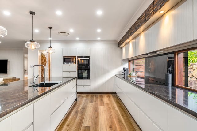 At the heart of the home, the open-plan living, dining, and kitchen areas are flooded with natural light and framed by timber bi-fold doors and shutters that open onto multiple alfresco zones. The gourmet kitchen is a true showstopper with granite benchtops, high-end appliances, a walk-in butler's pantry, and generous bench space - ideal for everyday living and entertaining alike.